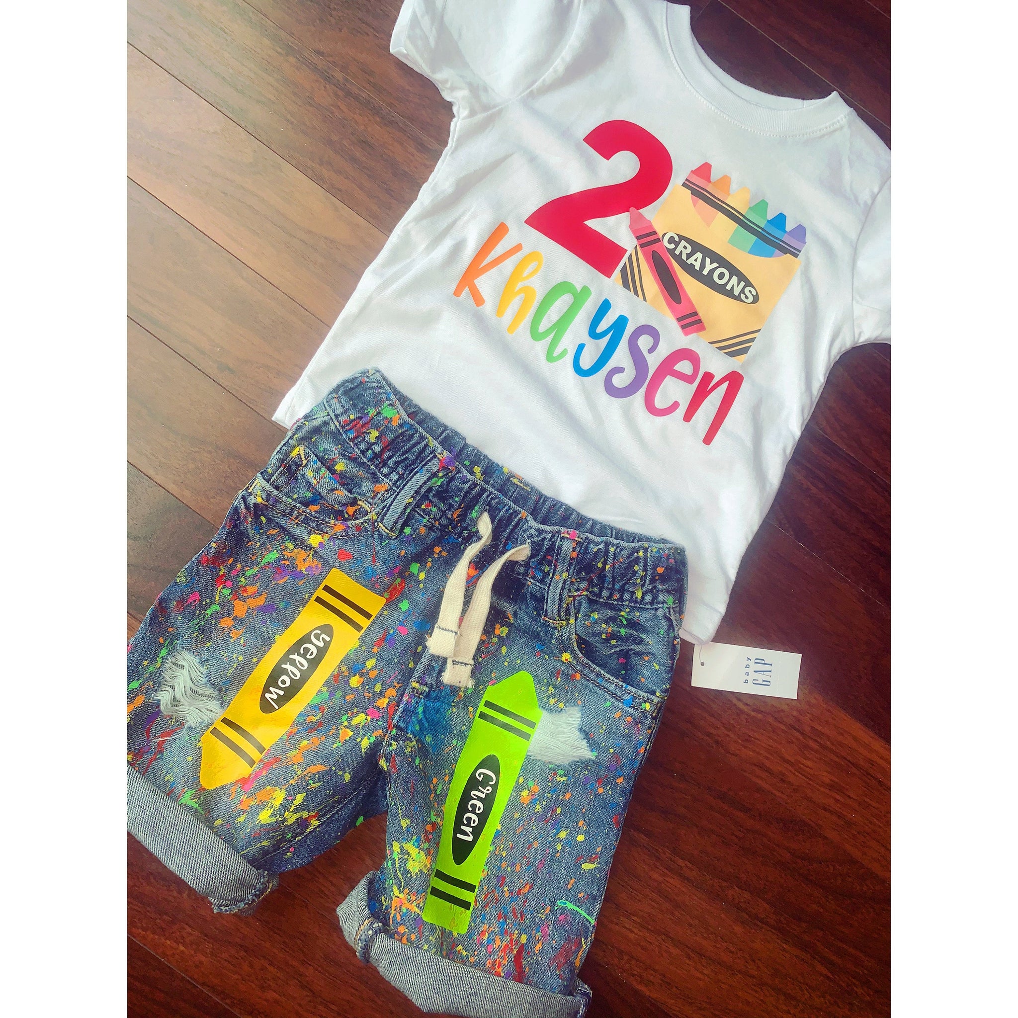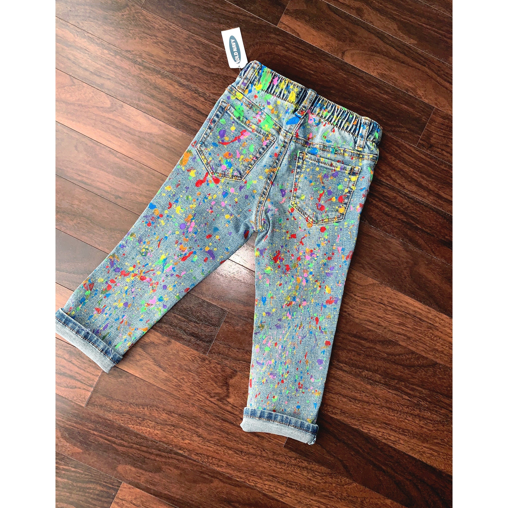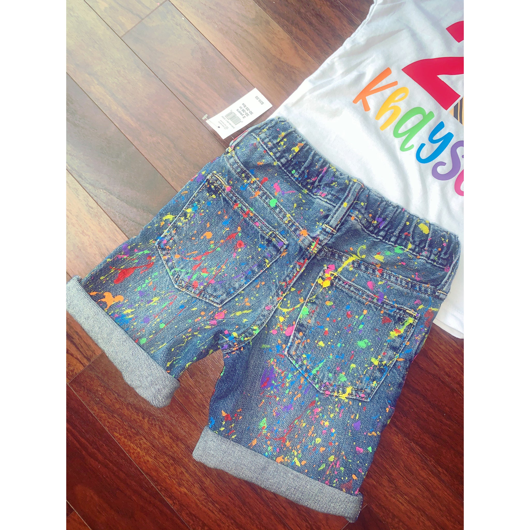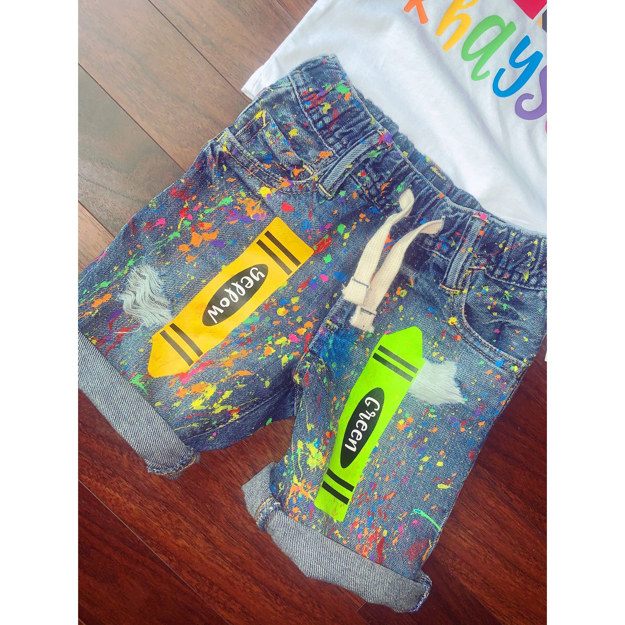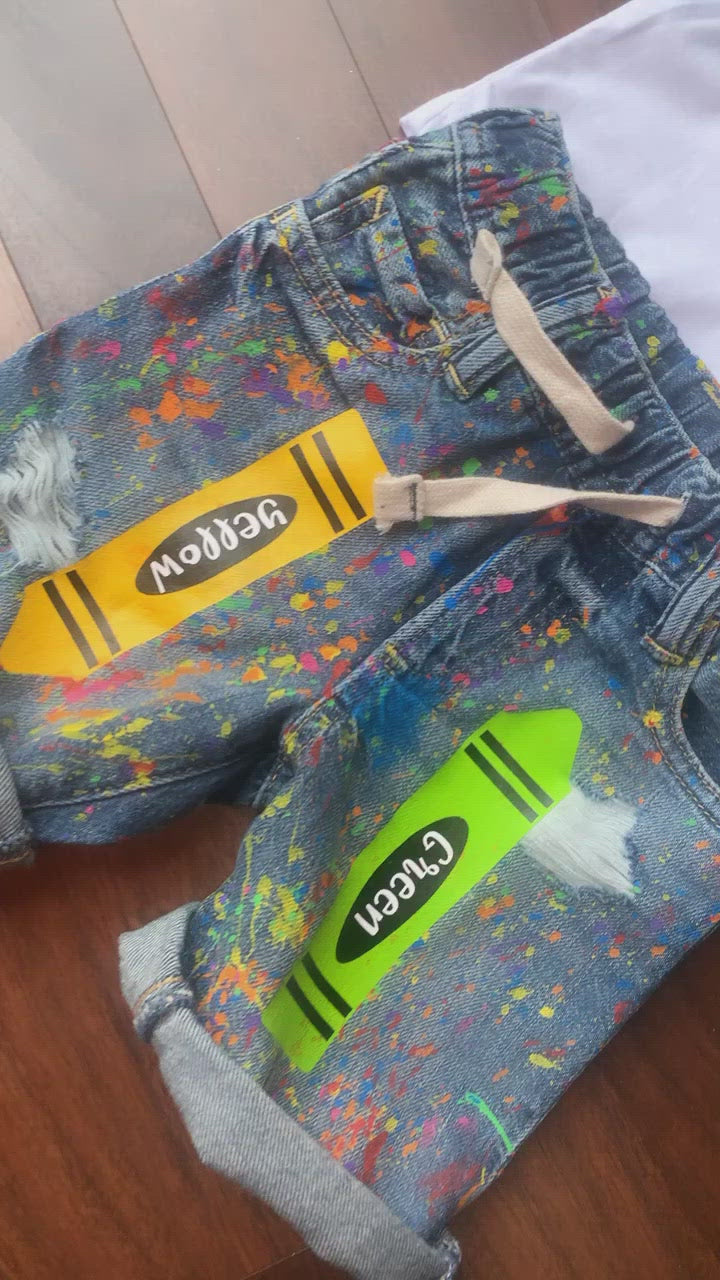 Each jeans or shorts is splattered with paint (red, orange, green, blue, pink, purple and yellow) and have crayons added on top.