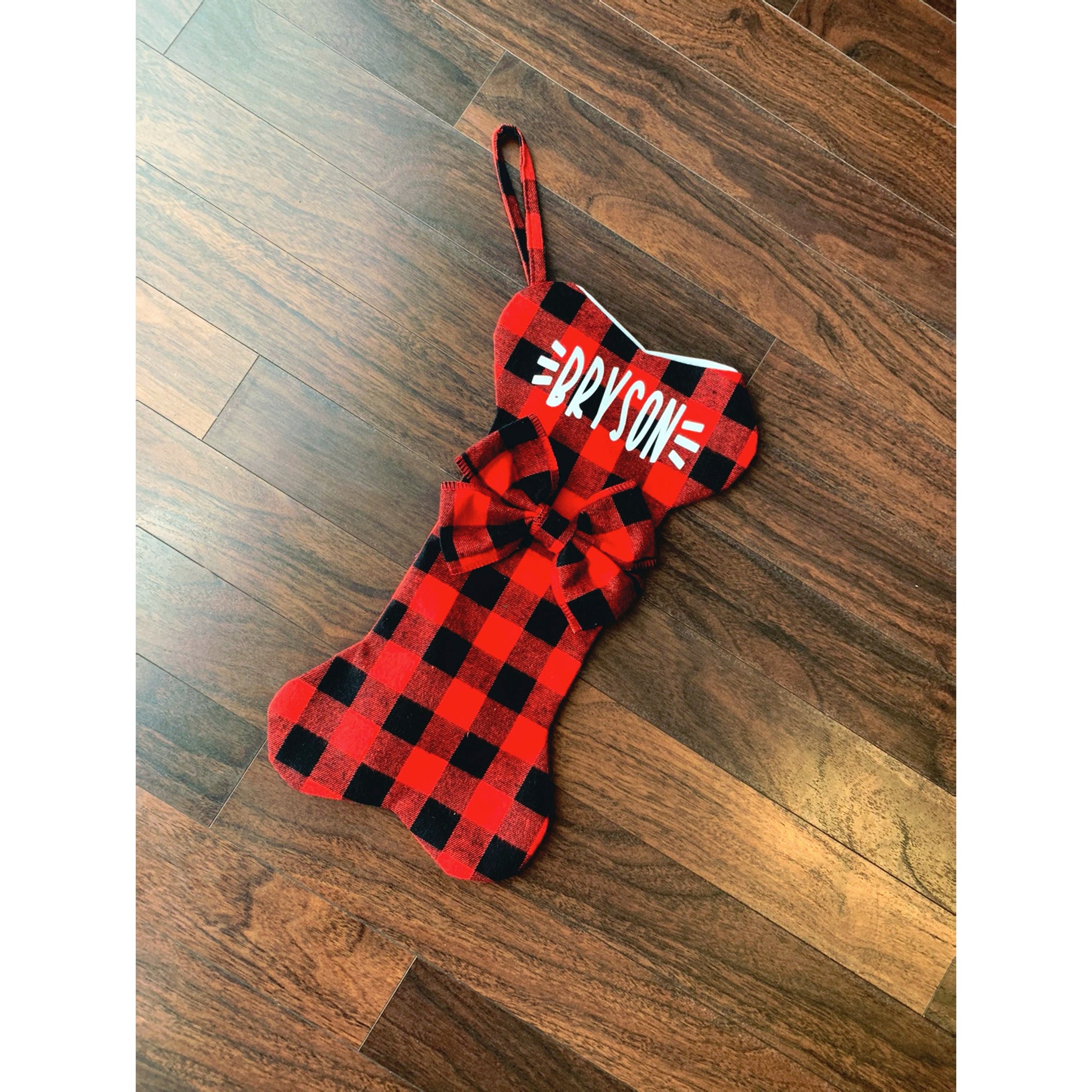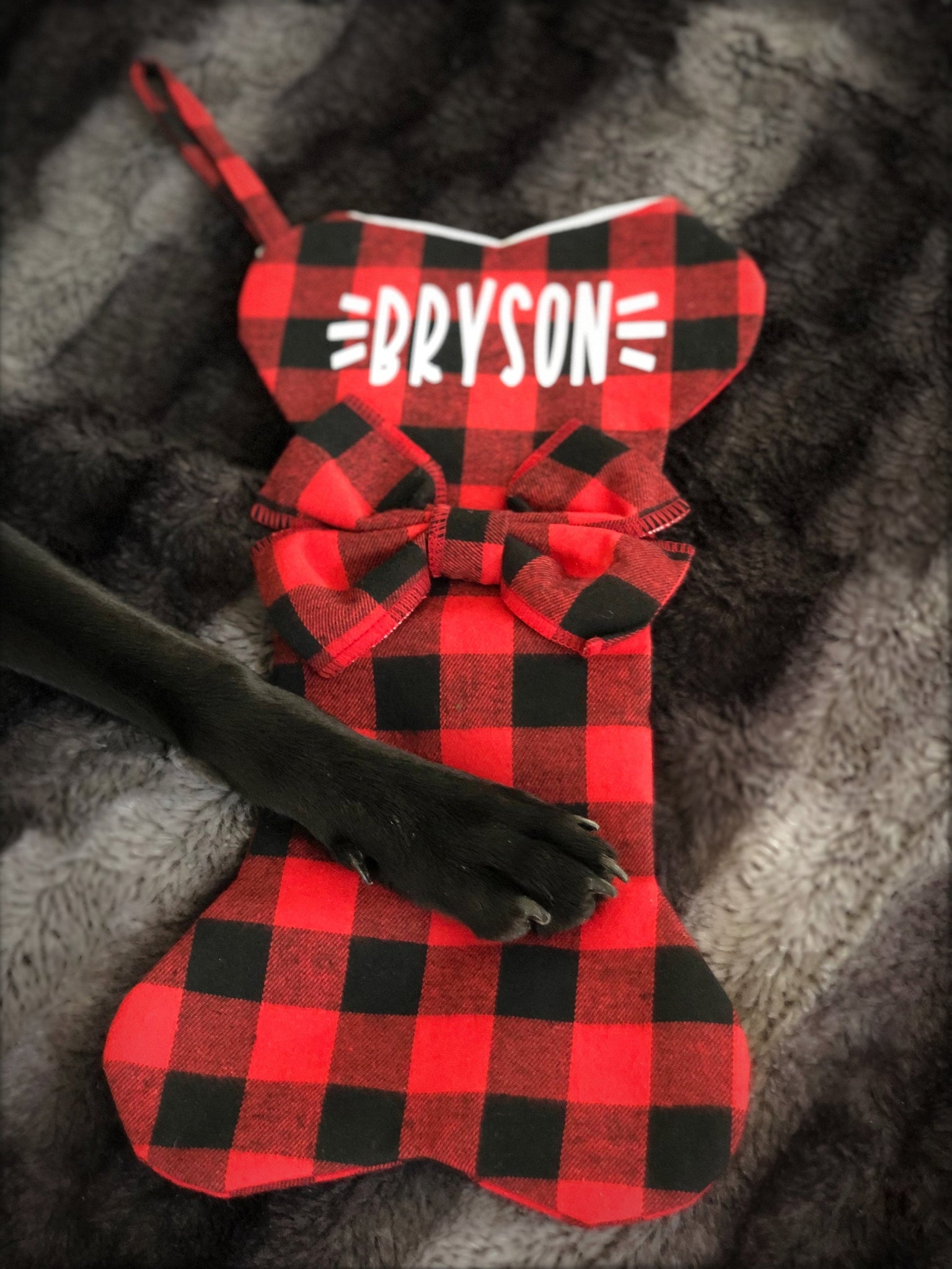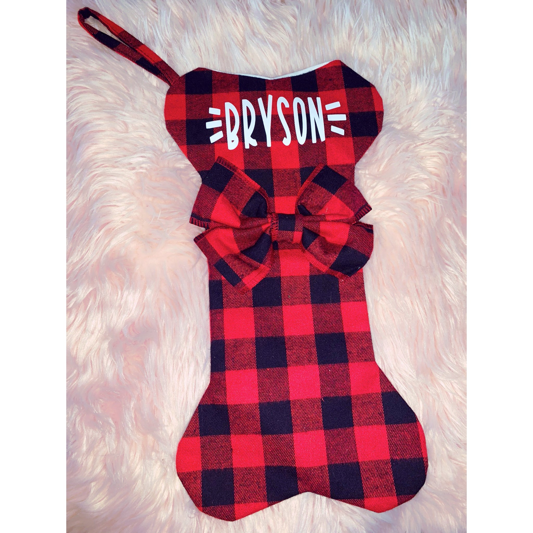 Who said the dog had to miss out on all the Christmas fun? This buffalo plaid bone stocking is will be the percent addition to your family stockings. Each stocking comes with your dogs name and a bow.