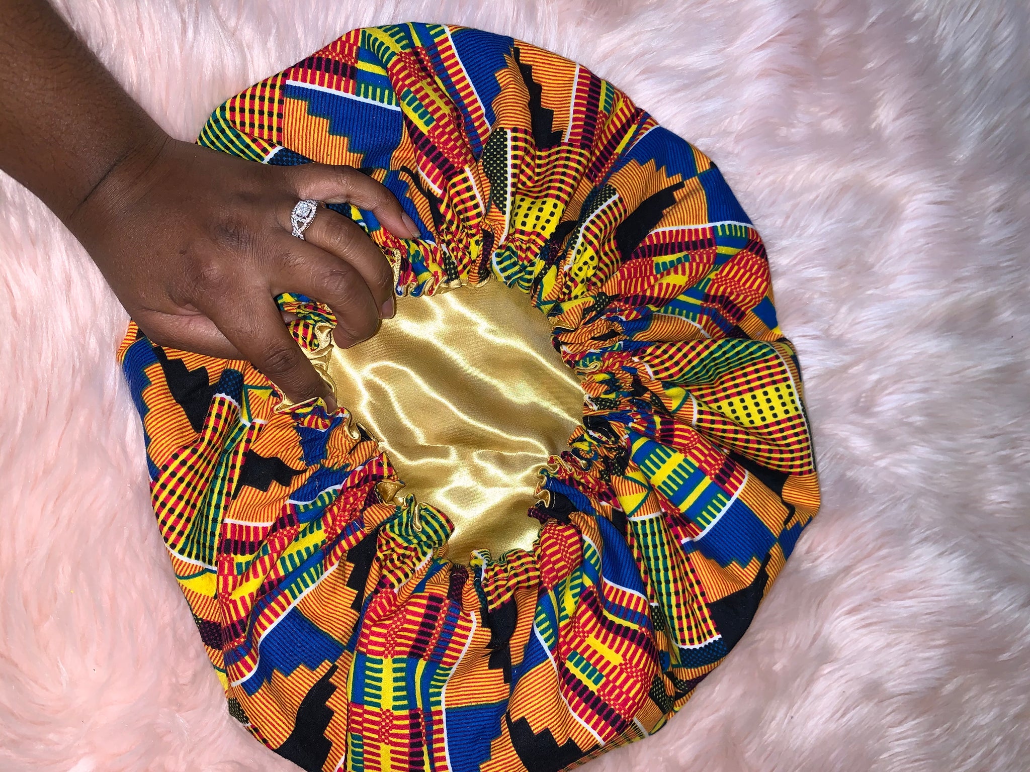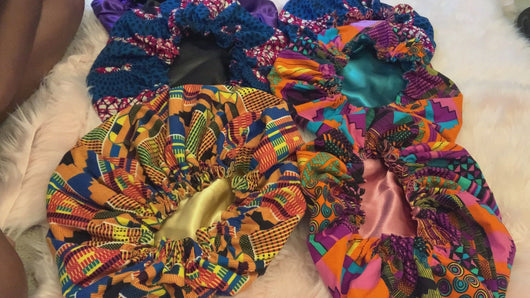 These bonnets are made with African kente print and a satin lined inside to keep your hair protected. Each bonnet is made from scratch with love and black girl magic. These bonnets come in a varity of sizes ranging from newborn to adults also available in Mommy and me sets.