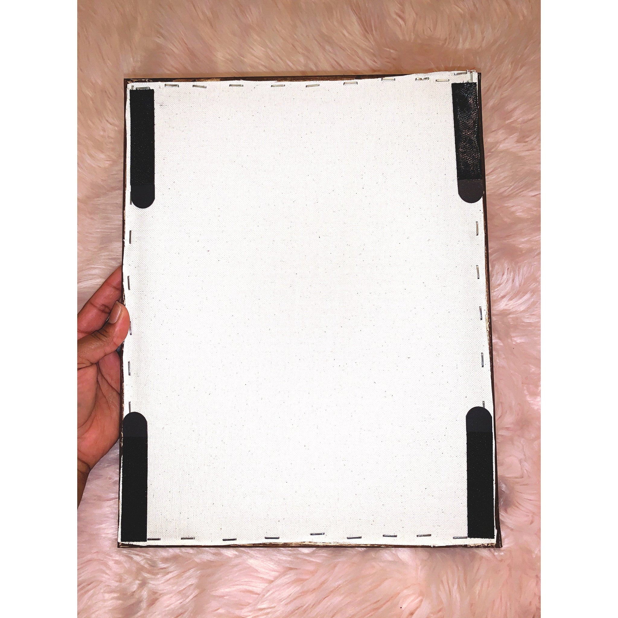This a reverse canvas is 11x14 inches and the frame is on the front so it will need to be hanged with command strips or double sided tape to allow it to stick on to the wall.