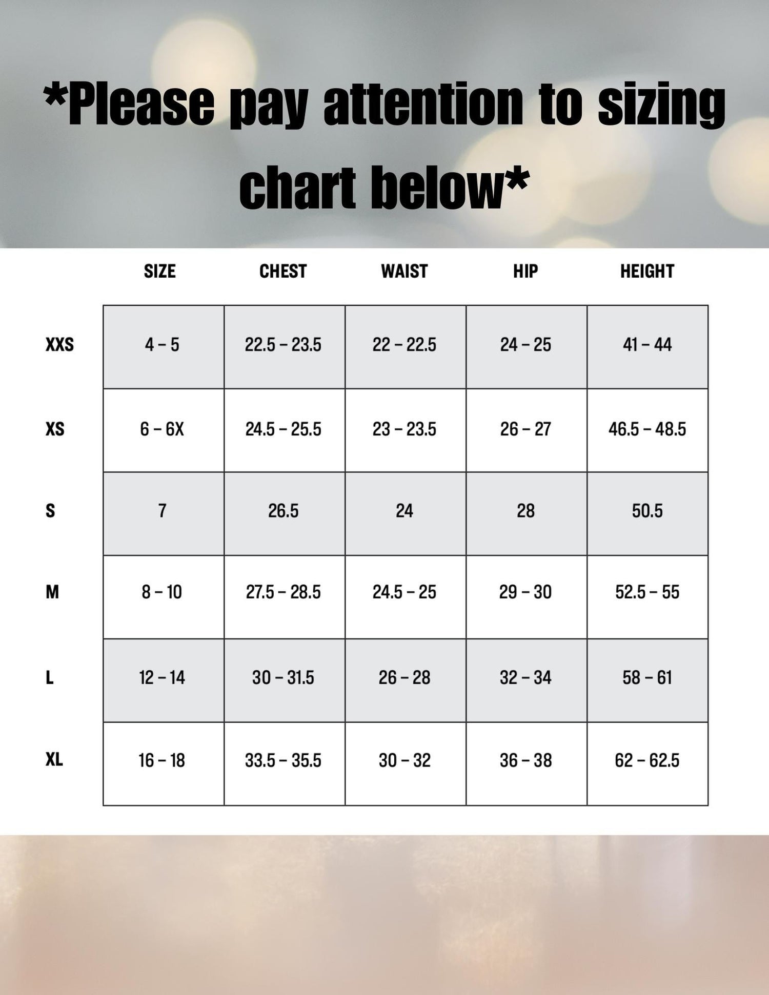*PLEASE PAY ATTENTION TO THE SIZING CHART BEFORE ORDERING, ONCE THE ORDER IS PLACED AND IN PROCESS ITEMS CAN NOT BE CHANGED OR REFUNDED.